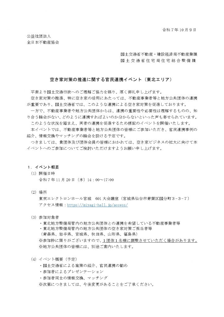 【国土交通省】空き家対策の推進に関する官民連携イベント(東北エリア) 2025.10.14 ご案内【PDF】 ・ チラシ【PDF】 公益社団法人全日本不動産協会秋田県本部 公益社団法人不動産保証協会秋田県本部 〒010-0951 秋田県秋田市山王5丁目9番11号 山王ガーデンビル1F-B 電話番号 / 018-827-7075 Fax番号 / 018-827-7076