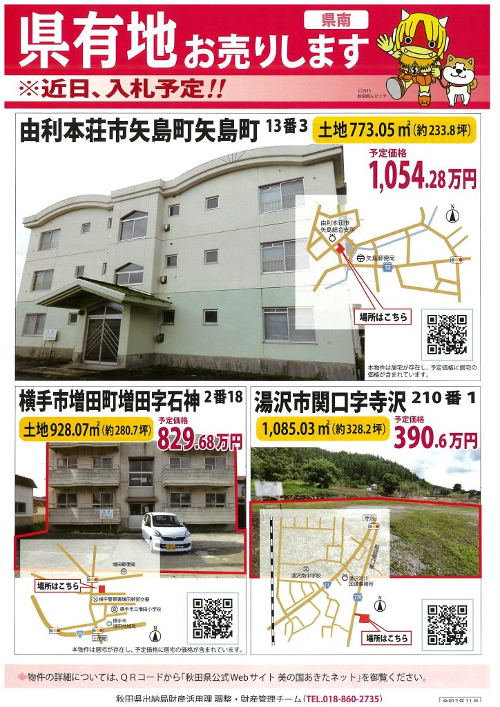 【秋田県】「県有財産売却のお知らせ」について 2025.11.07 秋田県出納局・財産活用課より、標記の件につきまして連絡がありましたのでお知らせいたします。 チラシのダウンロード☟【PDF】県央【PDF】県南 公益社団法人全日本不動産協会秋田県本部 公益社団法人不動産保証協会秋田県本部 〒010-0951 秋田県秋田市山王5丁目9番11号 山王ガーデンビル1F-B 電話番号 / 018-827-7075 Fax番号 / 018-827-7076