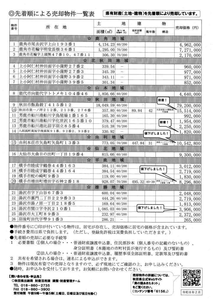 【秋田県】「県有財産売却のお知らせ」について 2026.02.03 秋田県出納局・財産活用課より、標記の件につきまして連絡がありましたのでお知らせいたします チラシのダウンロード☞ 県有地お売りします 公益社団法人全日本不動産協会秋田県本部 公益社団法人不動産保証協会秋田県本部 〒010-0951 秋田県秋田市山王5丁目9番11号 山王ガーデンビル1F-B 電話番号 / 018-827-7075 Fax番号 / 018-827-7076